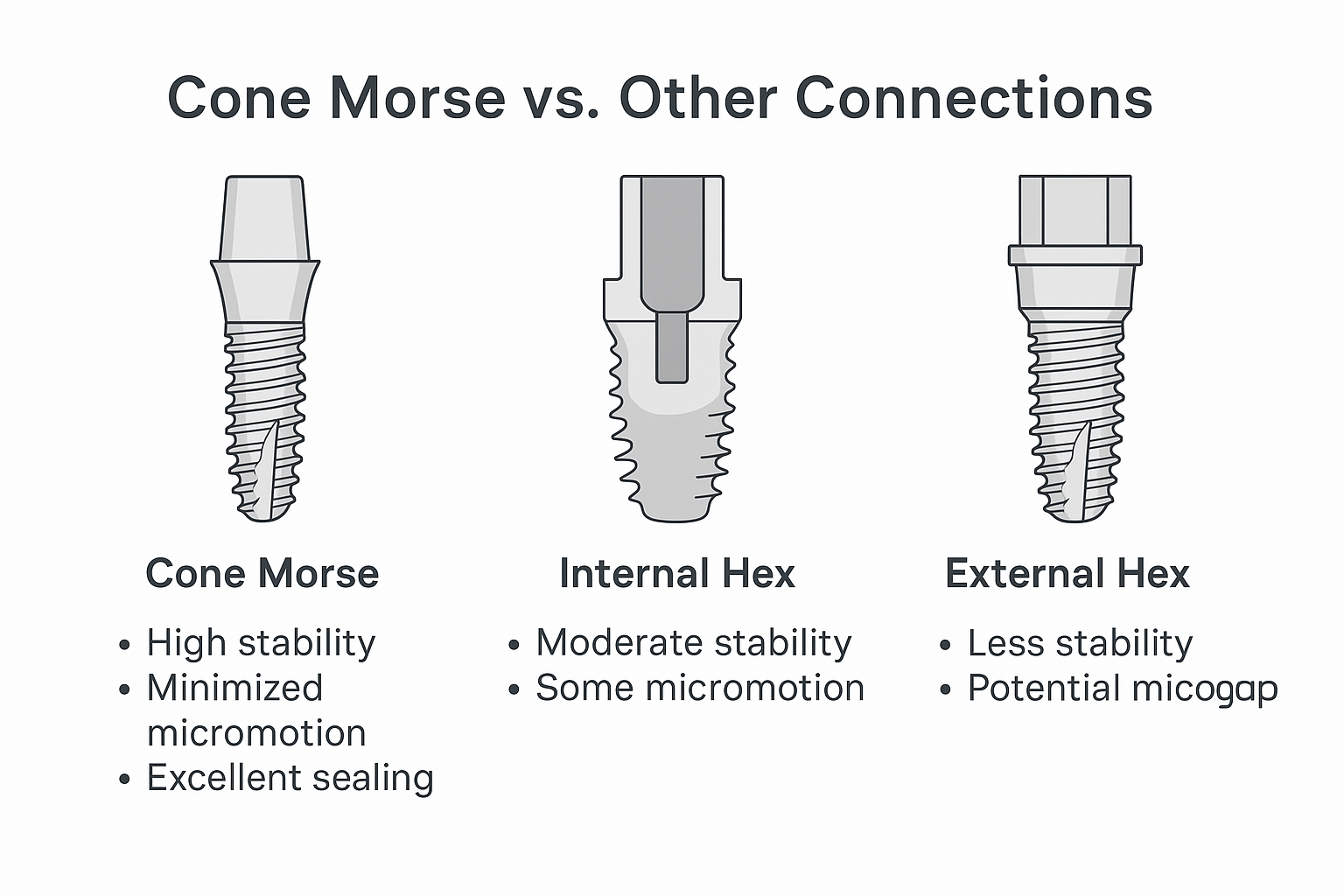In the field of dental implants, the type of connection between the implant and the abutment plays a significant role in long-term success. One connection system that stands out among others is the Cone Morse connection. But what exactly is Cone Morse, and how does it differ from other implant systems?